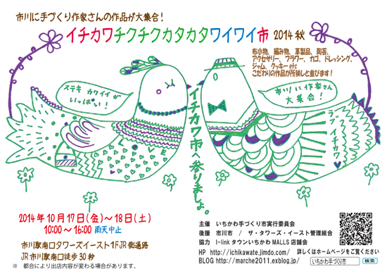イチカワチクチクカタカタワイワイ市2014秋に参加します。 2014年10月18日(土) JR市川駅前 こちらのイベントはJR市川駅からなんと徒歩30秒の好立地です♪ ぜひ、足をお運びください。 詳しくはこちら イチカワチクチクカタカタワイワイ市2014秋 |